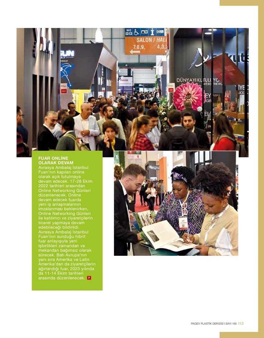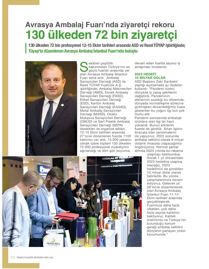 Avrasya Ambalaj İstanbul Fuarı önem verdiğimiz etkinliklerimizden birisidir. 2025 yılında 30.'su gerçekleştirilen fuarımız ilk yapıldığı yıldan bu yana yaklaşık 40 kat büyüme kat etmiştir. Fuara katılan firma sayısının artması beraberinde sergileme alanının da genişlemesine neden olurken; fuarın niteliklerinin de olumlu yönde gelişmeler gösterdiği gözlenmektedir. Avrupa genelinde büyüklük sıralamasında dördüncü sırayı, Avrupa'da her yıl düzenlenen fuarlar arasında ise en ön sırayı alan fuar Türkiye Ambalaj Endüstrisinin en güncel ve kapsamlı durumunu yansıtan ana platformdur. Sektörümüzün sergilendiği Fuarımızın eriştiği bu büyüklük boyutlarının yanında küresel piyasalarda tanınmışlığının da aynı ölçülerde sürdürülebilir biçimde geliştirilmesi konularında çalışmalarımız devam etmektedir. Fuarla ilgili daha ayrıntılı bilgiye http://www.packagingfair.com adresinden ulaşabilirsiniz.